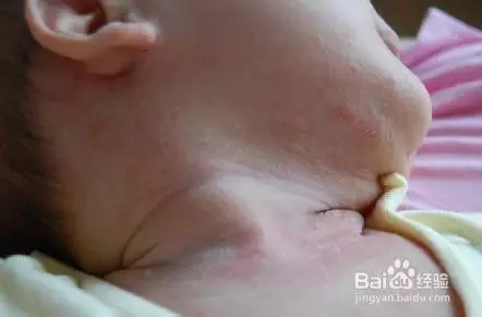 這張圖里寶寶脖子上的熱疹已開始連成一片,盡管如此但還是能看出有粒粒小疹子存在,這種情況在1歲內(nèi)的嬰兒里面比較常見,民間習慣把這叫“淹脖子”。